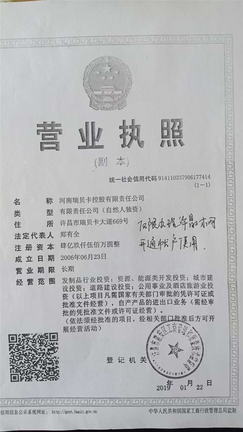 河南瑞贝卡控股(集团)有限公司,位于许昌瑞贝卡大道666号,2006年6月23日在河南省许昌县工商行政管理局注册成立集团公司。集团公司现下设五中心、两部和10个控股子公司、一个上市公司,已经形成发制品主业、资源型和服务型三大产业共同发展的格局,经营涉及发制品生产销售、高速公路运营、房地产开发、投资管理、水业、教育、酒店服务、矿业等八个行业。